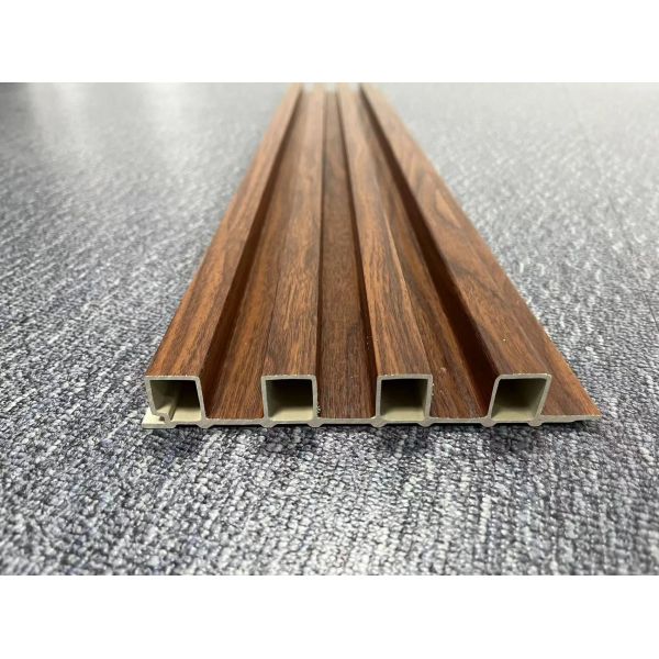HB-DECOR's WPC Fluted Panel is a composite Plastic-Wood mixture Fluted Panel with fireproof, flexural strength of 14Mpa, weight of 5kg/m2-7.5kg/m2, waterproof, and length of 3000mm.